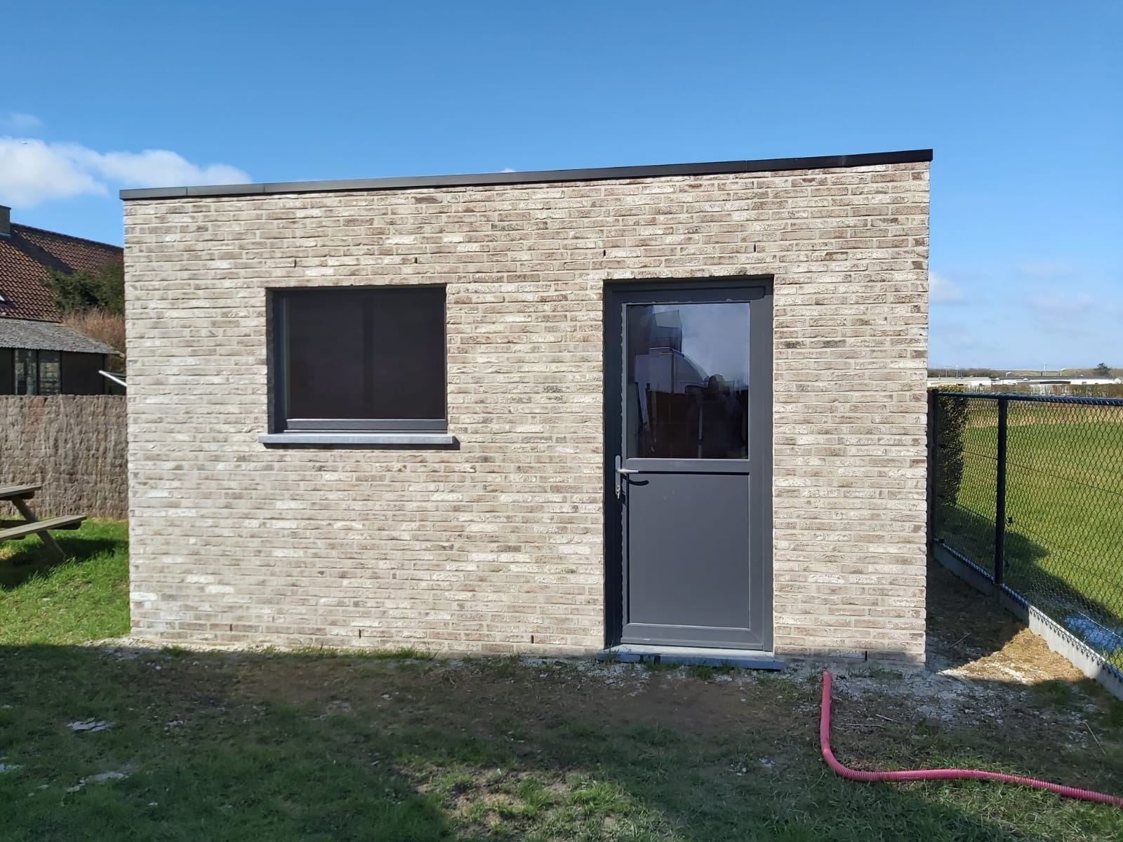 Voor het bouwen van dit tuinhuis voerden we als totaalaannemer de metselwerken, dakwerken , voegwerken en buitenschrijnwerken uit .